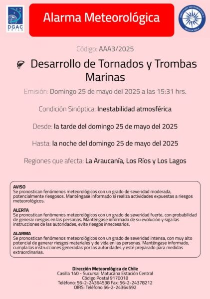 Eran las 15:15 horas, del 25 de mayo de 2025, cuando se dio alarma de tornado por parte de SENAPRED en las Regiones de la Araucanía, Los Ríos y Los Lagos. Habían pasado 21 minutos desde que un evento meteorológico, catalogado como EF1, se formara cercano a la comuna sureña de Puerto Varas. El tornado atravesó diversos sectores residenciales y céntricos de esa ciudad, dejando infraestructuras afectadas y más de 300 damnificados.